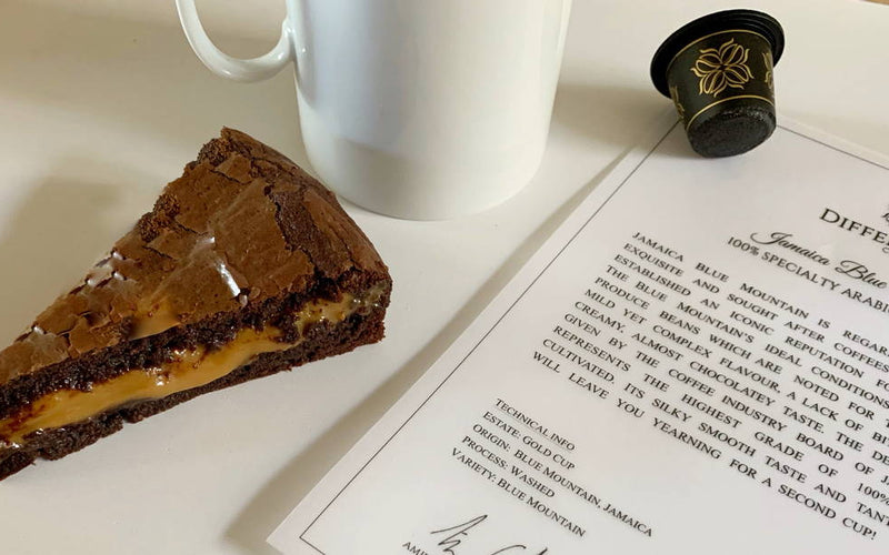 Chris Cleghorn’s Chocolate Salted Caramel and Jamaica Blue Mountain Brownie is a rich and decadent take on a favourite dessert. The recipe calls for both 70% dark chocolate and bitter cocoa powder along with our Jamaica Blue Mountain coffee, lending the brownies a wonderful depth and complexity. There’s also a salted caramel sauce, rich with double cream, swirled through the centre of the brownie.